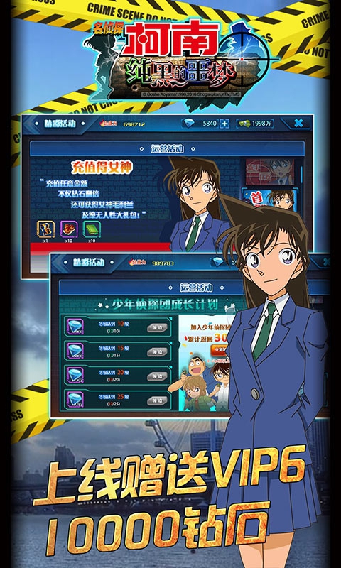2.上线送vip6,10000钻石,随意金额首充赠送童年女神小兰。