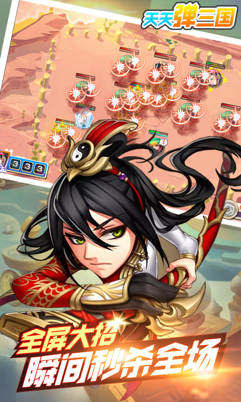 《天天弹三国》是一款以三国群雄跃起为故事背景的策略碰撞卡牌手游。以创新的碰撞战斗玩法,辅以由弱至强的策略引导,改写传统卡牌游戏一指单点“点”“点”“点”点到湿的呆板操作,打破了无脑看着屏幕等待的僵局。玩家任意手指在屏幕上纵情滑动,辅以丰富的武将技能搭配组合,尽享酷炫技能带来的极致视觉体验。