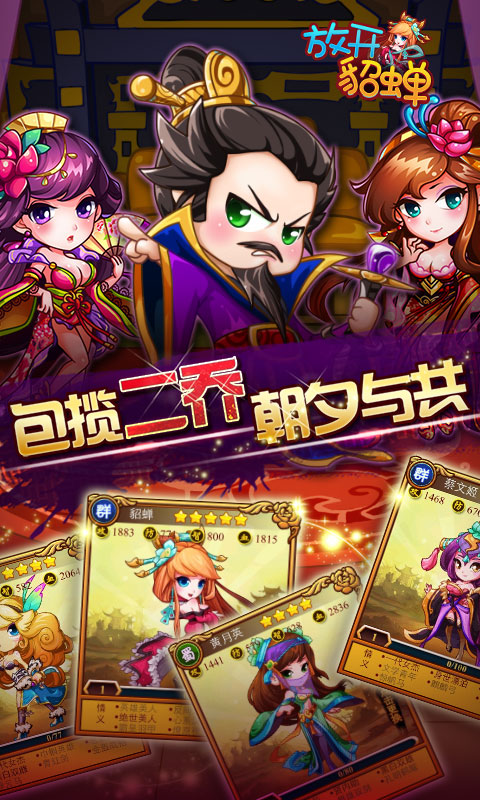 《放开貂蝉变态版》是一款卡牌策略类型的手机网络游戏,以三国演义为背景,卡牌 国战玩法为核心,q版卡通的画面。玩家通过征讨、擂台、通天塔、国战、铜雀台等玩法与其他玩家竞技,也可以重新领略三国演义的魅力。
