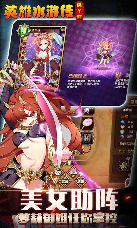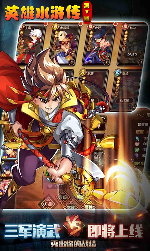 《英雄水浒》是一款以水浒传为题材的半即时横版手游。三分钟即可上手,十分钟阵容即可搭配完成,快速刺激的玩家深受广大玩家喜爱!不再受收集卡牌阵容的烦恼!可选择手动或自动战斗模式,解放双手不伤肝!将为广大玩家带来畅快淋漓的打击感、独特的小伙伴缘分组合、百变搞怪的108星将、简明易懂的收集养成系统、支持好友联机等创新体验!