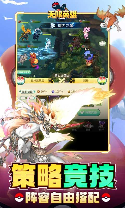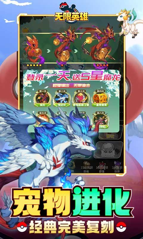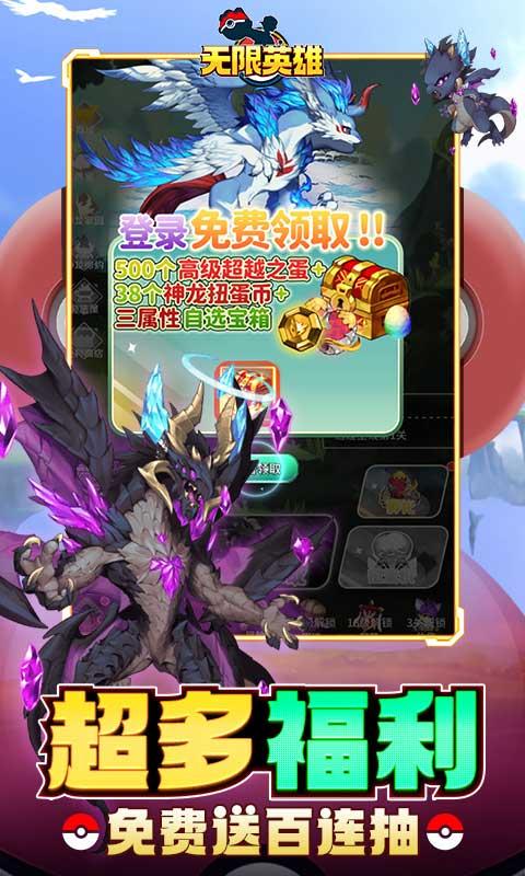《无限英雄》是一款小精灵题材的休闲养成的放置卡牌手游,在这里你将扮演强大的驯龙师,再强大的神龙都会臣服于你,游戏上线就超级福利大礼包,登录即可开启获得500高招 38指定招募!首日登录送5星魔龙,通关免费赠送自选100连抽。上百种不同特征属性的神龙供你挑选培育,每只神龙都有初阶、中阶、高阶三种不同形态,会从可爱的幼龙进化成霸气威武的神龙!