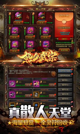 《热血武宗》是一款经典传奇全新高攻速高爆率版本手游,游戏上线v11白银猎人直升卡、神兽白虎、100w元宝、修罗神剑、登录免费送全神器,上线即拥有400%满攻速及200%移动速度!超高爆率刀刀爆光柱,神装神器全能爆,海量道具灵符回收,0氪也能享受充值快感,全新麻雀、魂环、异火系统等你体验,登录免费万年魂环、及全部神器!