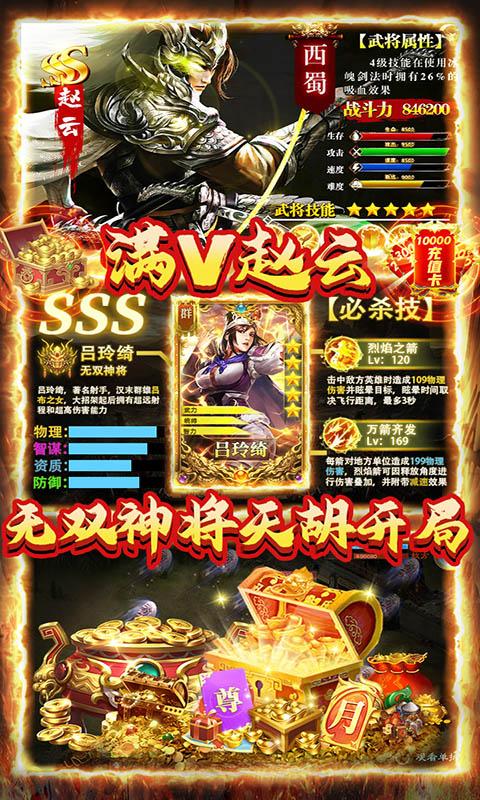 ※ 登录即送满级vip、无双赵云、一百万元宝、一百万铜钱、限定称号、海量资源大礼包。