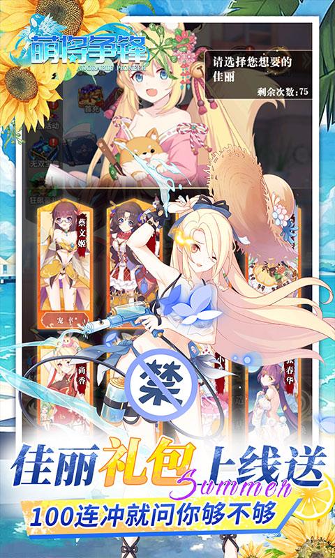 《萌将争锋(萌妹之三国无双)》是一款萌系娘化三国挂机手游;玩家穿越至娘化三国世界,邂逅各种旷世名将妹妹,并在三国中一举成名;上线送50000现金券,萌妹宝箱,佳丽嗨嗨卡,货币千万,这种开局简直无敌;无限选妃正式开启,保底1红,无限刷无限红,分分钟红将到手;帝王特权加持王道,刷充提额点点免费充纵享丝滑;妹纸妹纸妹纸还是妹纸,这样的世界还不来玩?