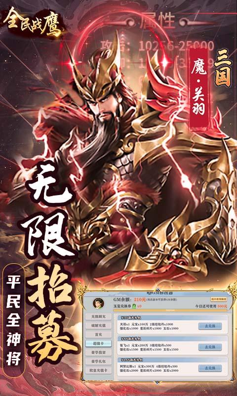 《全民战鹰(余额代充版)》游戏是一款写实风养成卡牌手游,游戏以一个架空的世界观的为背景,上线送vip12 白嫖满v,百万元宝,免费充值拿多少,手速说了算,更有gm修改器,首充/月卡全免费,签到每天送充,闯关领百万充值,七日领终极神将,无限资源免费解锁!