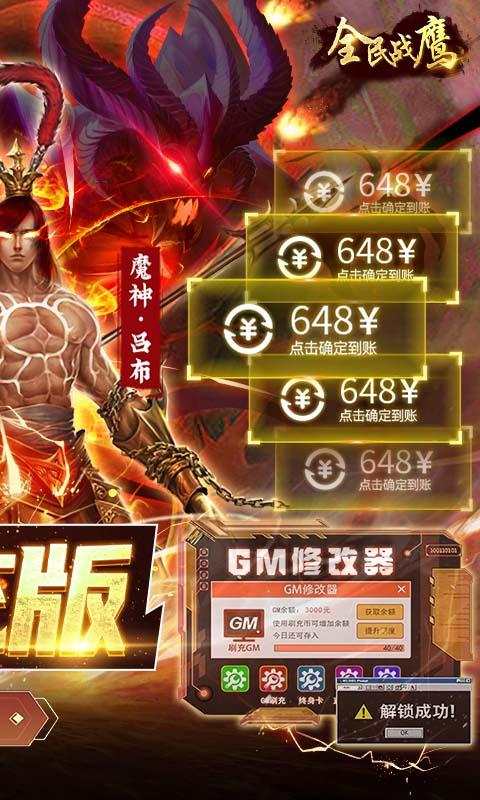 1.上线送vip12,充值比例:1:10000,激活修改器、首充、月卡、无限资源免费激活;