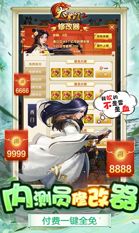 1、内测员专属修改器,游戏付费一键全免,助你登顶榜一!