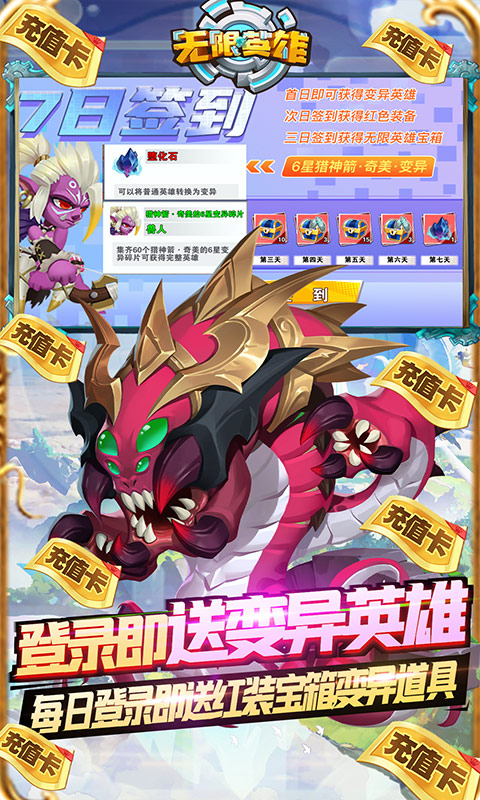 2、七日签到即送变异英雄,自选红色装备,堕化石(升级英雄为变异英雄)