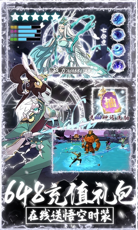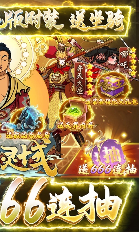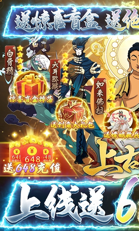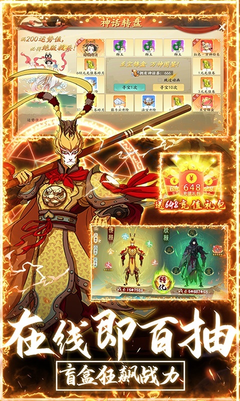 1.上线赠送vip6、648充值卡礼包、悟空金甲时装、极品坐骑、神话666抽