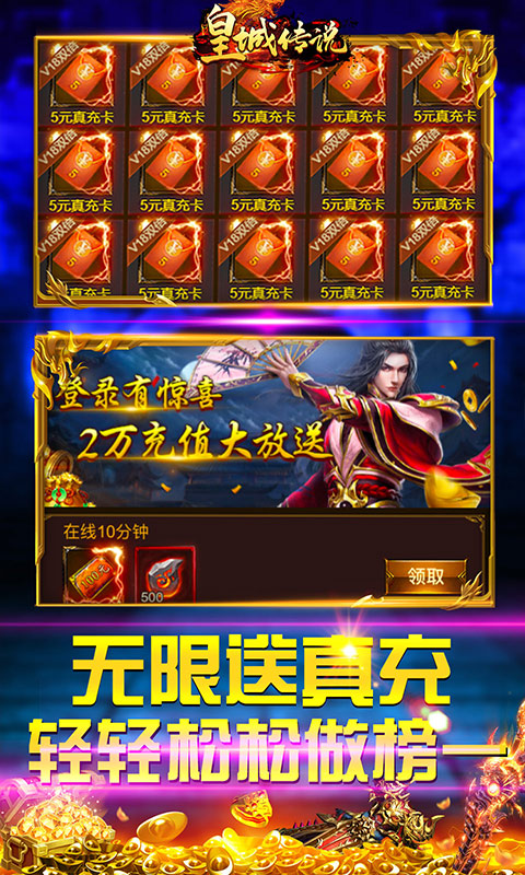 经典传奇手游《皇城传说(送gm无限充)》携最强gm福利华丽归来!上线激活gm特权,快速开启gm商城,绝版时装海量材料无限领取!boss爆率全部上调1000%,无限爆真充,福利拉满在线打金!每日领取gm指令,无限领取金币元宝真充卡!快邀请兄弟齐聚沙城,称霸全服!
