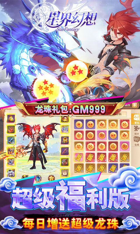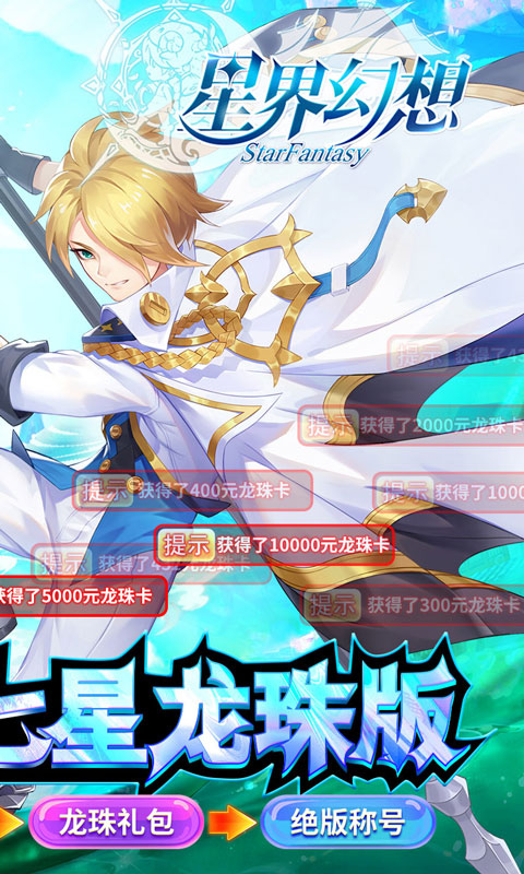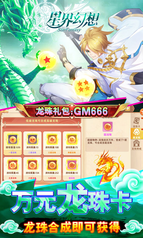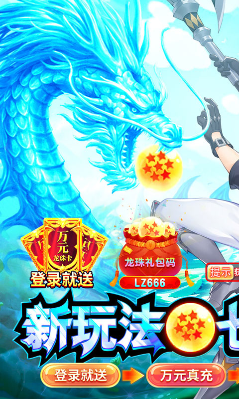 后缀说明:上线送一万元真充卡,通过游戏内收集神珠,可开启神龙祈愿,中大奖(ssr翅膀,顶级星灵)