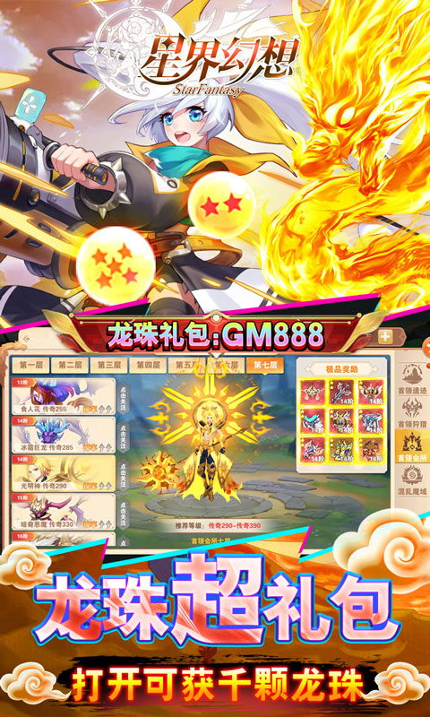 上线送vip8、万元真充卡、500w金币、8.8w钻石、龙珠超礼包