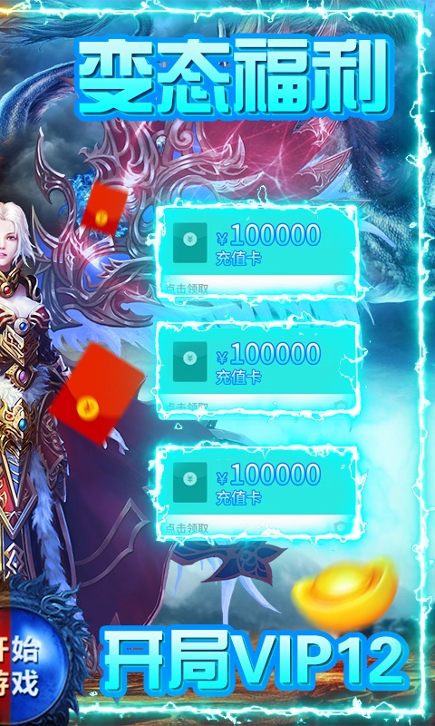 2.主界面-万元充值,登陆即可领取总额1w元充值卡及其他稀有道具,领取后无门槛直接使用