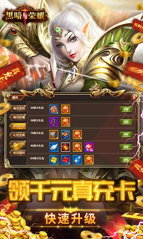 《黑暗与荣耀送百万钻石》是一款3dmmo暗黑冒险手游,vip9,钻石*218888,绑定钻石*288888,金币*3888w,装备寻宝券*10,狂欢大礼包*1,稀世称号后续登录还能获取海量道具、高阶装备,更可领取礼包获得史诗级宠物!