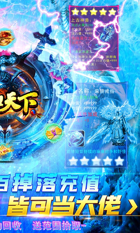 开局送全套终极技能,爆率提升100倍,刀刀爆充值!打怪免费送vip,全档位vip会员统统可免费激活!终极神装打怪掉,自动挂机,自由交易,超级神器、极限满攻速,酣畅淋漓的战斗,带给你最刺激的传奇体验!