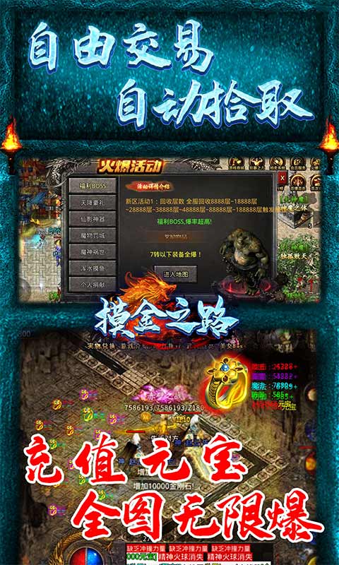 摸金之路(冰雪无限刀)单职业经典复古冰雪传奇。游戏开局送绝版戒指,首充十元送全屏拾取功能,平民玩家也能玩得爽!所有装备均可掉落!主要玩法以升级、爆装、攻沙为核心,实现自由交易、一键回收等真实的传奇精彩玩法!喜欢冰雪复古玩法的玩家绝不能错过哦!
