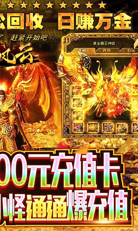 《铁血风云-日爆一万充》是一款经典三职业,福利超bt的传奇手游,在线即送充值卡,可触发活动;同时boss,小怪大量爆充值卡,充值卡碎片,福利全放开,完全自食其力,散人党的最佳选择