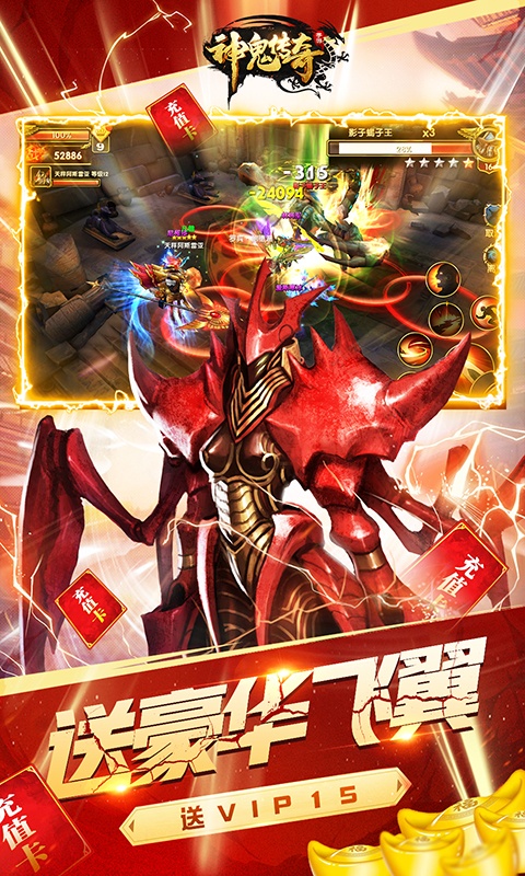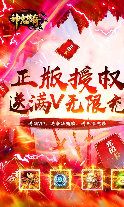 《神鬼传奇-满v无限充》是一款大型3d仙魔风格mmo手游。精致的美术画面通过炫酷3d效果为玩家呈现了一个人魔大战的历史战场。绚丽坐骑、特色宠物、逆天神器、极品装备、超级boss、征途历练等玩法供玩家探索,踏上君王之路。全自由化的pk对抗,极致激爽的战斗对决,将最大限度满足你对仙魔手游的所有幻想!!