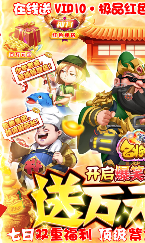 1、上线送vip8、极品红色神将、创角福利宝箱、专属称号(新手引导后在主界面上线福利入口领取)