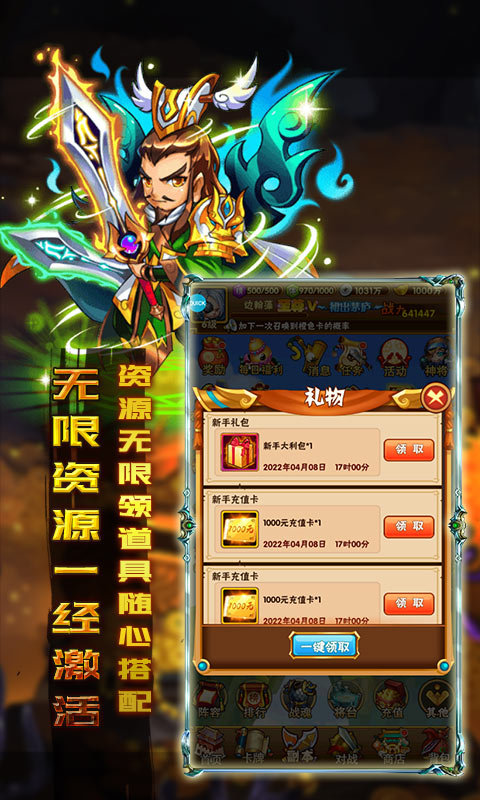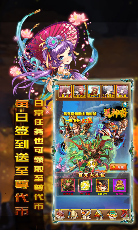 主角因偶然穿越三国时期,带领众多伙伴对抗黑暗势力,组建属于自己的队伍成员,崭露头角,披荆斩棘,上线福利更是多多,上线即得全图鉴卡,无门槛得神卡,副本掉落真充,每日签到送三国超币,免费拿资源和神将商城等级,带你角逐三国之巅,随意搭配巅峰阵容!