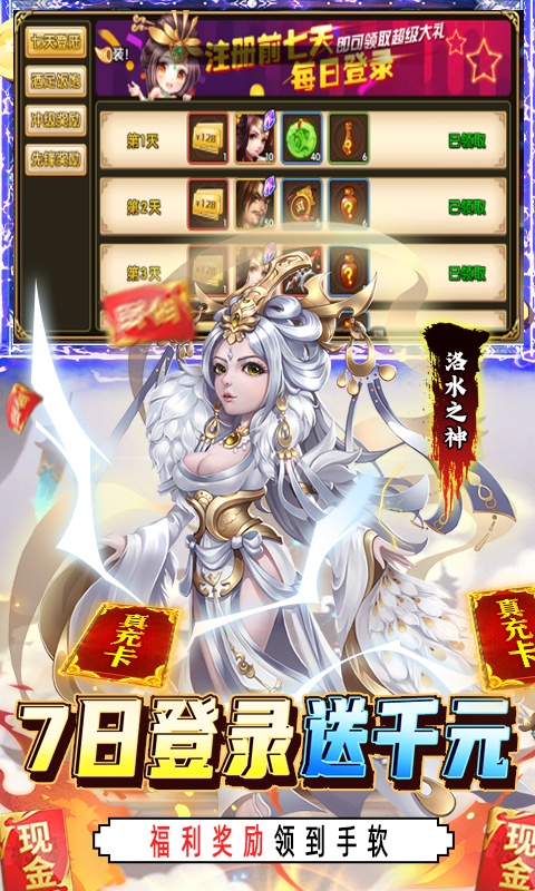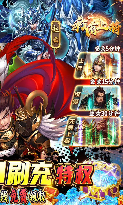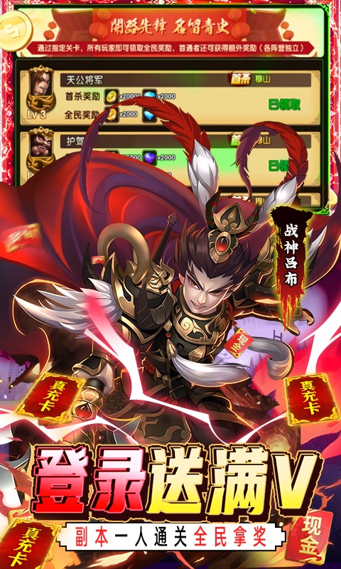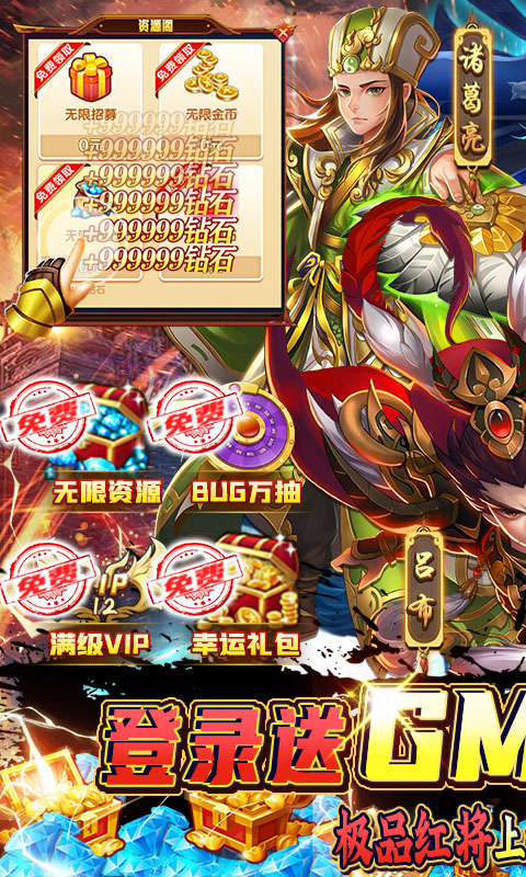 1、上线即送红将诸葛亮、vip12、钻石*10w、金币100w、随机初级药剂*10