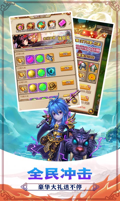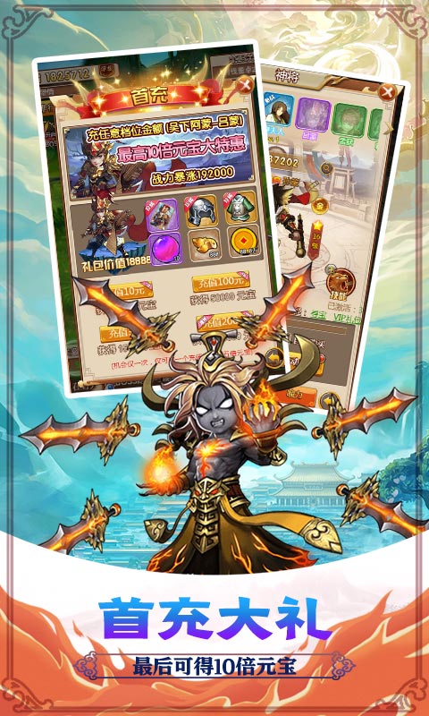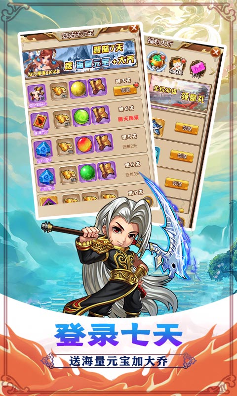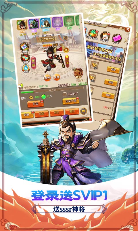 1、上线就送svip1、sssr神将、10000元宝、500万金币