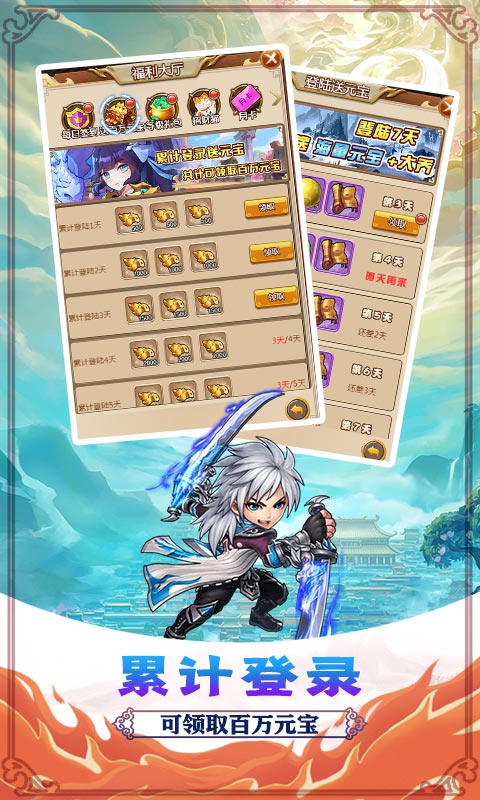 后缀说明:累计登陆送元宝共计可领取百万元宝