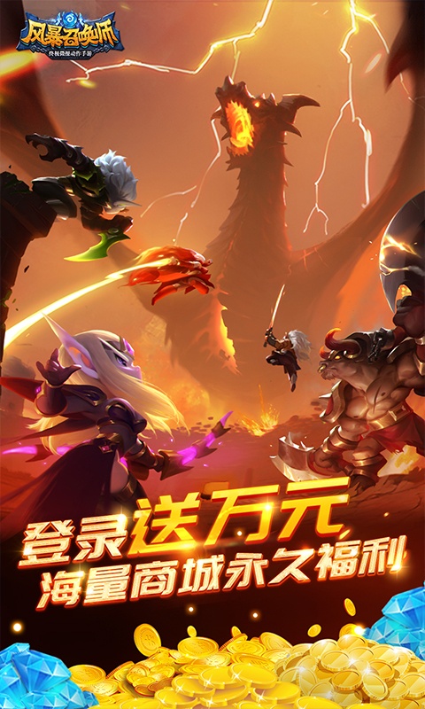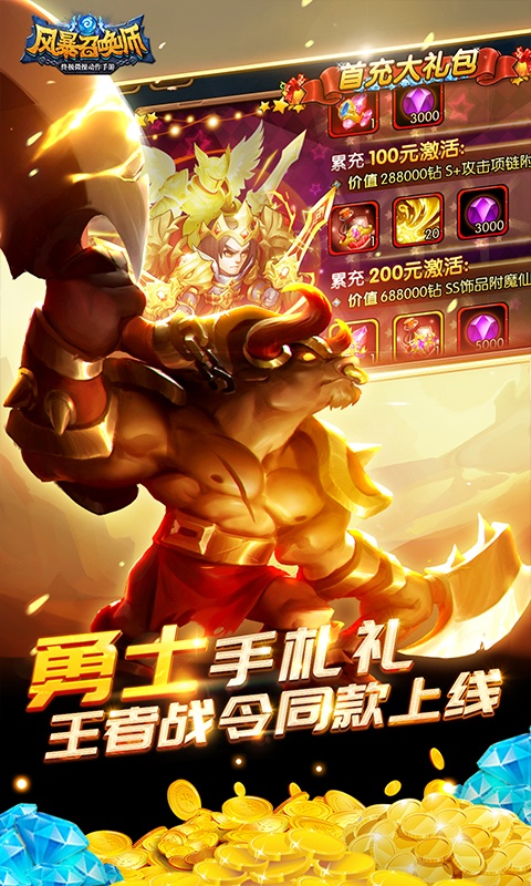 1、上线即送10000个召唤令,vip20,钻石*38888,金币*300w,超万元的充值卡