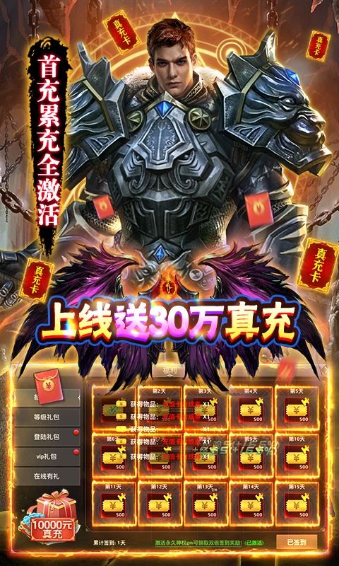 1、上线送满级vip,送1亿金币,300万紫钻和200万钻石,无门槛万元真实充值在线就领,每日登陆还能领十万真充