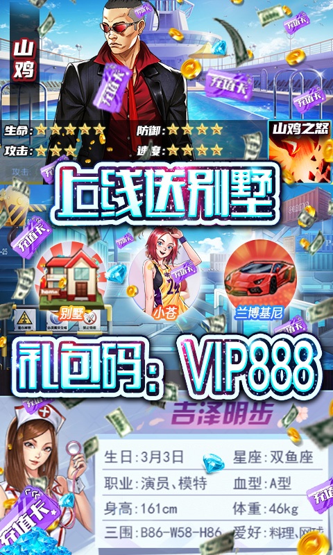 1.上线免费千元充值卡,千元充值卡直升svip1!!!188888钞票、神车ae86、陈浩南,礼包太多根本写不完!!充值比例1:500