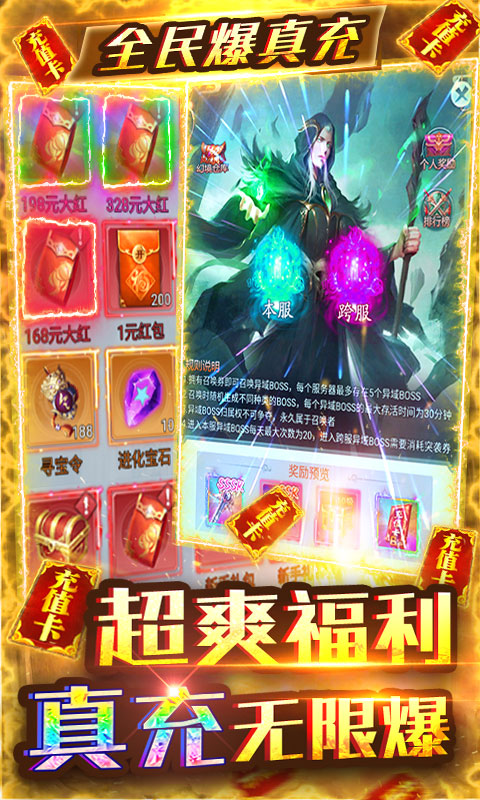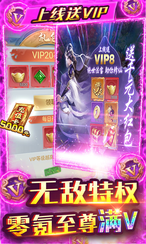 1.上线送28888元宝、千元大礼包、188寻宝令、入门礼包