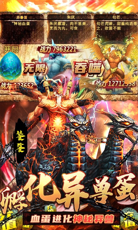 《御剑封神录-真吞噬异兽》是一款上古洪荒神兽结合恢弘的封神世界观、视觉感十足的画面体验、质感超强的战斗特效的游戏,神话题材山海经,海量异兽等你解锁,吞噬进阶提高战力,真正的异兽吞噬游戏,开局一颗蛋,进化全靠吞,异兽不断吞噬进化的游戏,吞噬提升异兽等级,还有超多吞噬种类等你解锁,玄龟、腾蛇、朱厌、烛龙等等!绝对是你寻找的广告中的山海经吞噬游戏,快来下载吧!