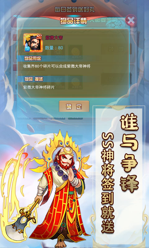 3、七天福利天天送充值,每日签到送ss级神将紫薇大帝