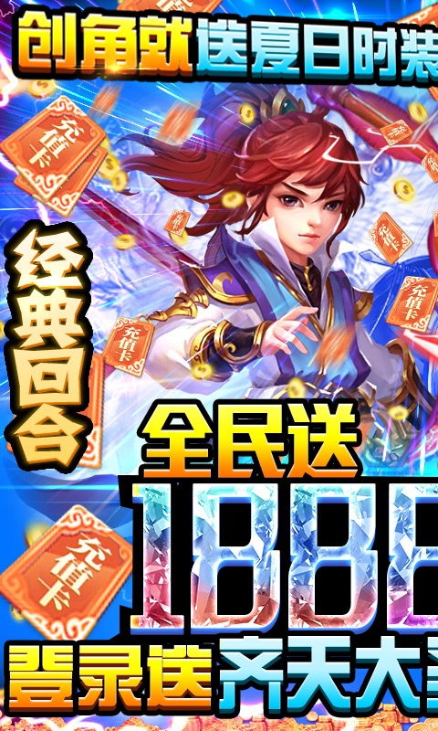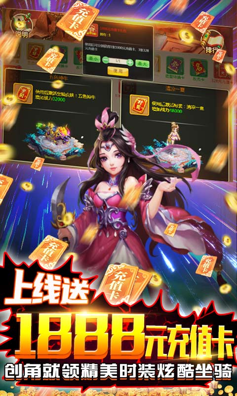 1.上线送满v,创角即送48888元宝,还有1888元充值卡礼包相送,累计可获得100w元宝。超高充值比例1:500!开局即送“清凉一夏”精美时装,还有炫酷坐骑皮肤“五色神牛相送”,超多奖励领不完!
