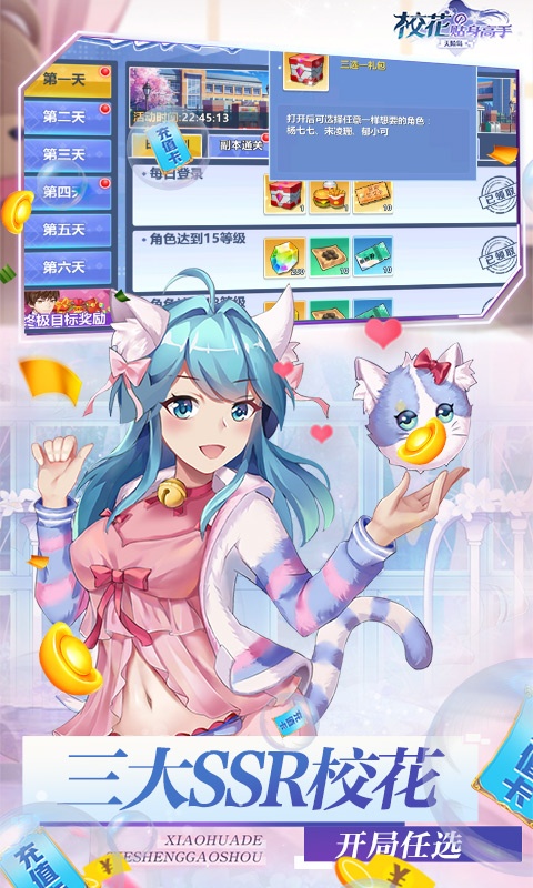 后缀说明:七日登录送ssr校花,等级领取超过万元充值