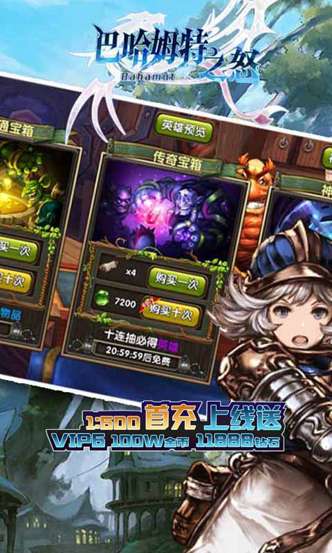 《巴哈姆特之怒变态版》是一款回合制卡牌类手机游戏,登录即送vip6,正常游戏五分钟即可获得妮娜,沙利尔等强力英雄。精彩绝伦的魔幻战斗画面,多种多样的阵容搭配,古典魔幻的地下城、血战模式,精彩的竞技场、神殿,奇妙的神器锻造之旅、武器锻造店和兽王秘境等众多副本,还有众多魔幻英雄美女在游戏中等待你,还在等什么,一起加入《巴哈姆特之怒变态版》,体验属于你的魔幻游戏之旅!
