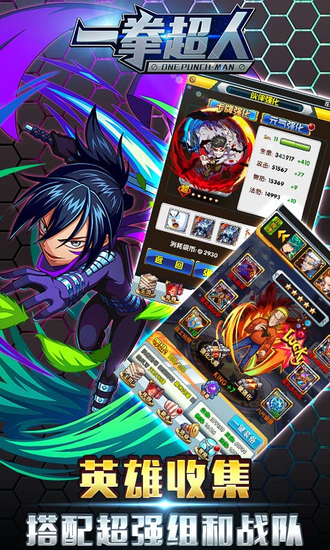 《一拳超人》源自日本漫画,人物角色和场景百分百还原动漫剧情的手游大作。游戏讲述了原本是一名普通人的光头琦玉,因为兴趣使然的关系梦想成为一个英雄,通过加入英雄协会拼命锻炼和晋级,终于脱胎换骨获得了强的力量,与众多英雄一起开始了对抗各种怪人以及灾难的生活。