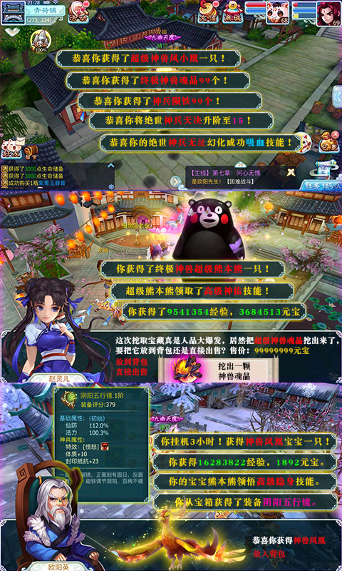4、上线送50000绑定元宝,9999999铜钱,88888银票,免费赠送异兽·鲲坐骑,次日免费送神兽、送时装