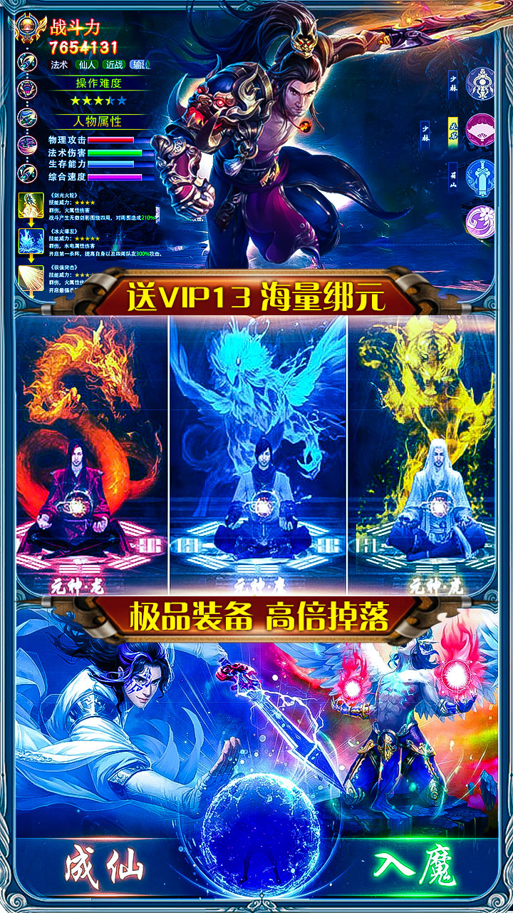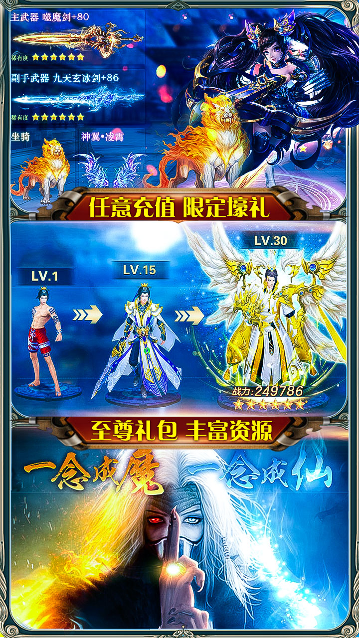 御龙传奇(海量特权)是一款仙侠角色扮演类手游,游戏中拥有丰富的角色养成系统,你可以通过装备的强化锻造冶炼来为自己增加超多的属性以及强力特技,还可以通过喂养坐骑升阶羽翼来提升自己的外观特效,当然这些也是有属性加成的,非常的划算又适合你装逼耍帅。精致的美术画面通过炫酷3d效果为玩家呈现了一个人魔大战的历史战场。绚丽坐骑、特色宠物、逆天神器、极品装备、超级boss、征途历练等玩法供玩家探索,踏上君王之路。全自由化的pk对抗,极致激爽的战斗对决,将最大限度满足你对仙魔手游的所有幻想!