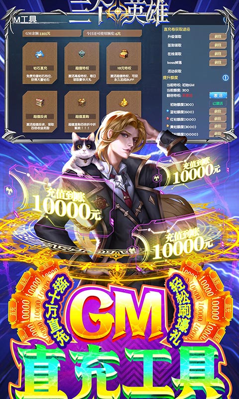 3、送专属gm工具,超值特权,投资,直购礼包,海量豪礼免费刷充