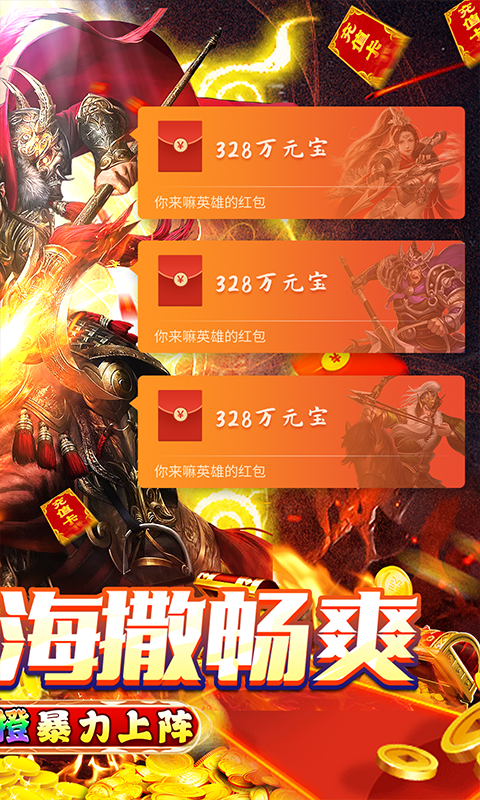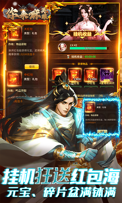 3.挂机产出大量红包,产出元宝、充值卡、武将碎片