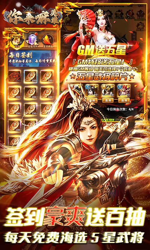 《你来嘛英雄(gm满编制开冲)》是一款以三国为背景的写实画风的放置养成游戏,上线送5星5橙将,直接暴发户式开局,从此通关再也不是问题,一路平推;每天签到送100连抽,爽的不行;gm修改器版,刷充余额无上限,刷多少用多少,不要陷阱不要套路;挂机产出海量红包,充值卡、碎片、元宝全部大量送送送!!这还不来?等什么呢?!