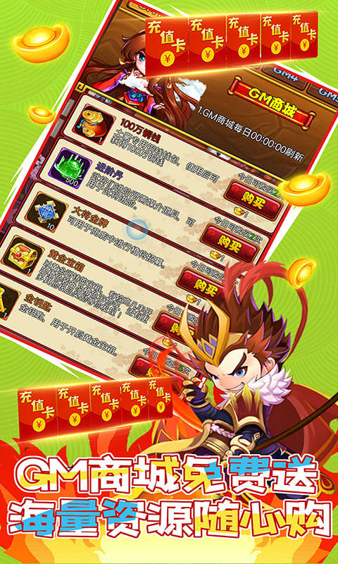 3.gm商城每天领取海量资源,充值卡只需1元宝。