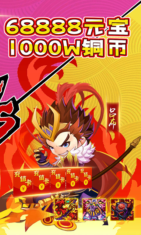 1.创角即送q萌5星张飞、gm1、328充值卡、元宝68888、银两1000w、欧皇转盘礼券*50
