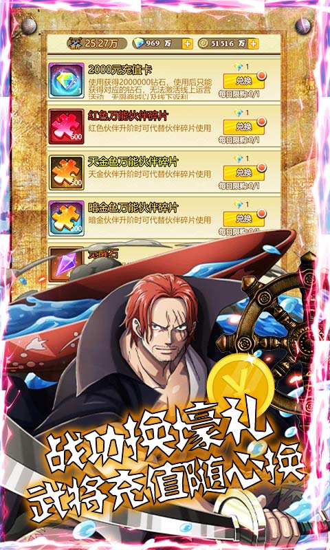 1.上线赠送vip20,288888钻石,1000万贝利,1000战功。