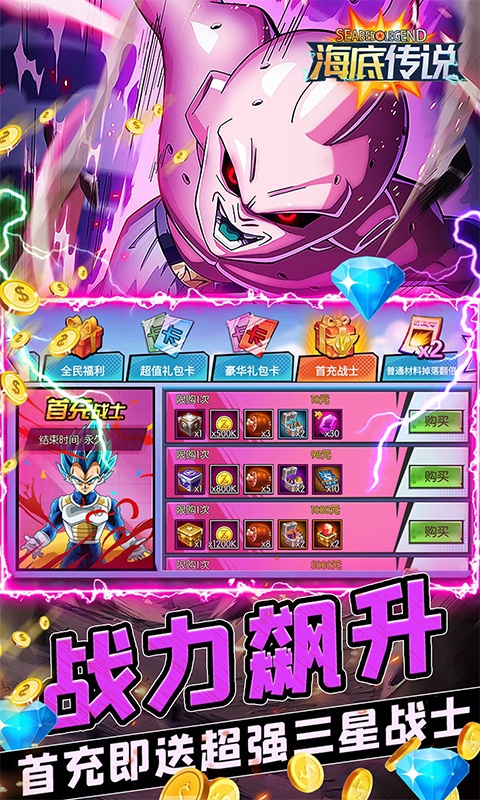 3.充值比例1:500,首充双倍钻石返利,首充即送超强三星sss级战士、海量金币,以及各种稀有道具。