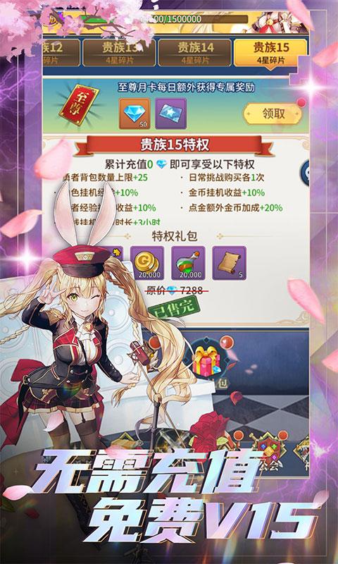 1、上线就送贵族15,通过指定关卡开启万抽转盘。
