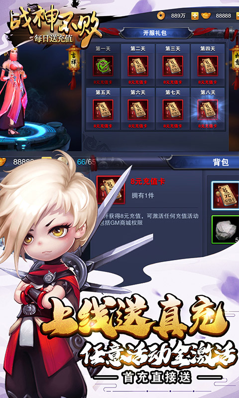 1、每日送真·充值卡,所有充值活动全激活,首充直接白送