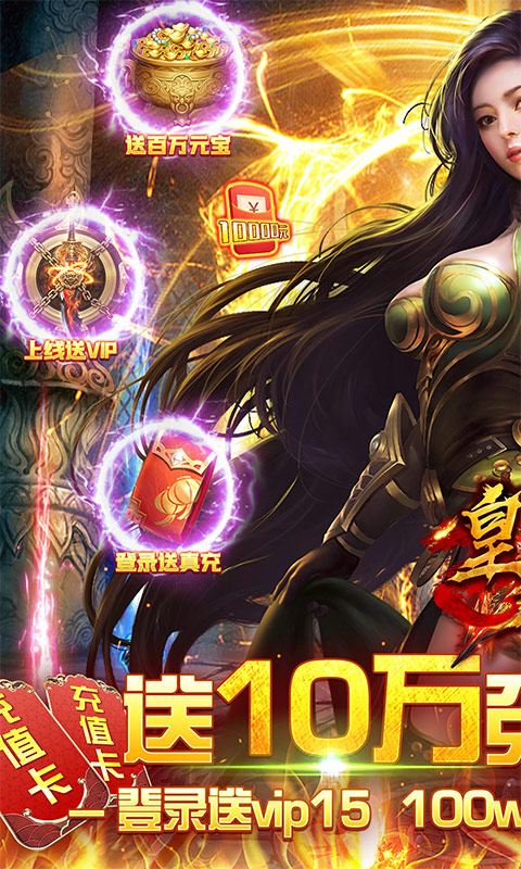 1、上线送vip15,元宝*1000000,金币*10000万、绝版酷炫时装!