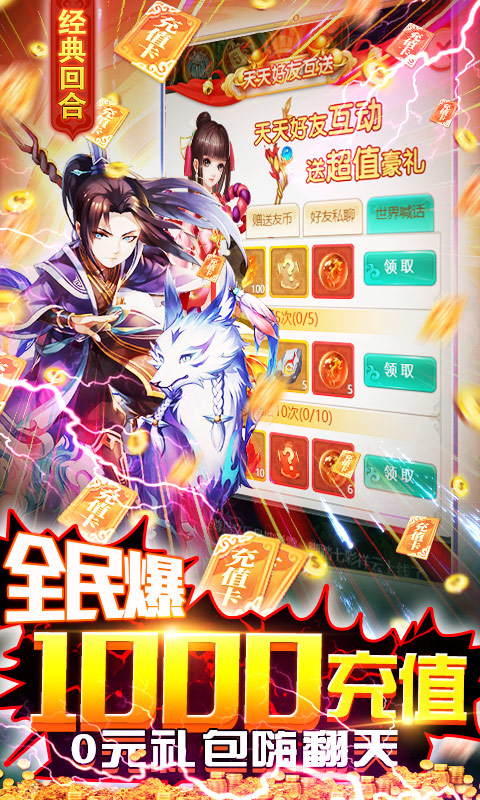2.充值比例1:1000!天天挂机百分百爆送充值卡,经典上古仙侠题材经典回合制手游,海量福利等你拿!